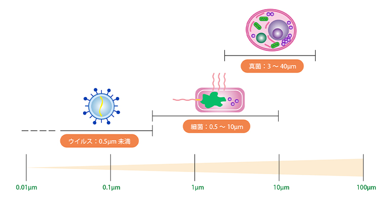 まず大きさですが、ウイルスの大きさは細菌のだいたい10分の1くらいです。