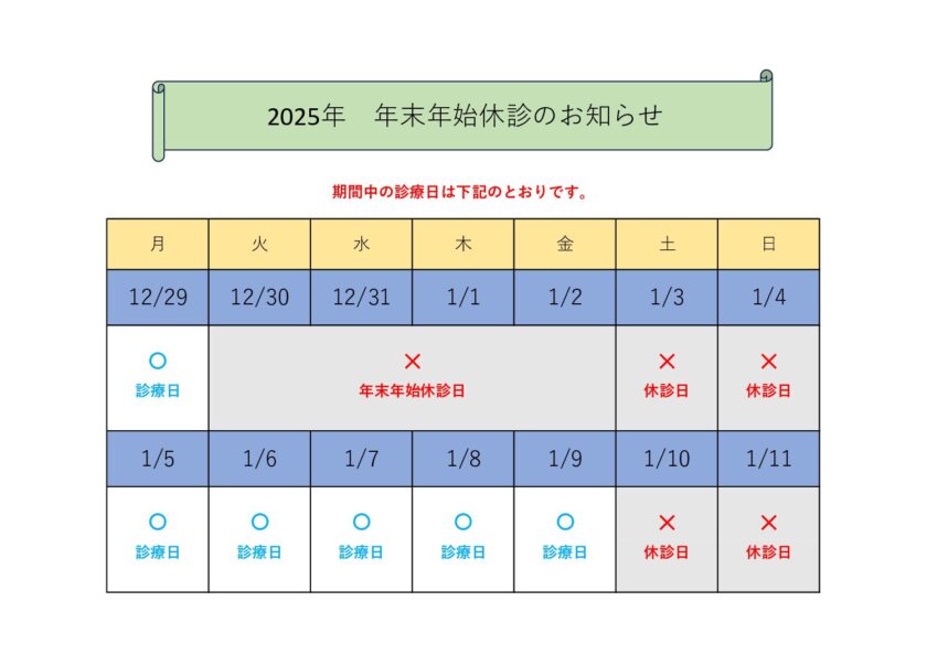 年末年始の診療体制について 投稿日:2025.11.04 平素より、当院をご利用いただきまして、誠にありがとうございます。 2025年~2026年の年末年始の診療体制につきまして以下の通りお伝えいたします。 2025年は1/5(月)より通常診療にて対応いたします。ご不便をおかけいたしますが、ご理解の程よろしくお願いいたします。