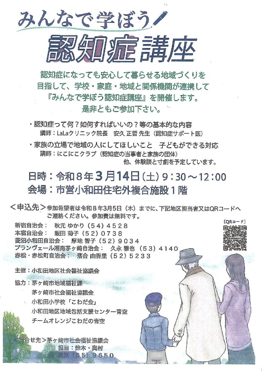 認知症講座の開催のお知らせ 投稿日:2026.01.30 小和田地区社会福祉協議会主催の講座に院長が講師として参加します!! 小和田地区社会福祉協議会主催の【みんなで学ぼう 認知症講座】が令和8年3月14日(土)に開催されます。 当院の安久院長が講師として登壇いたしますので、是非ご参加ください。 【日時】令和8年3月14日(土)9:30~12:30 【会場】市営小和田住宅外複合施設1階